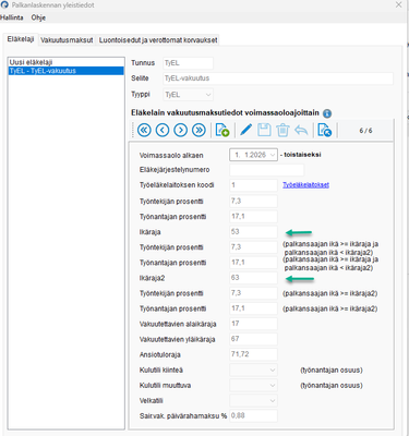Vuonna 2026 53–62-vuotiaiden työntekijöiden korotettu maksu poistuu. Tämän johdosta palkanlaskennan yleistiedoissa sekä ikäraja ja ikäraja2 prosentti arvot ovat samat. Tarkista siis etenkin...