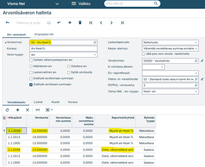 Haluamme tiedottaa tulevasta muutoksesta arvonlisäverokantaan, joka astuu voimaan 1.1.2026. Alennettu arvonlisäkanta laskee nykyisestä 14 %:sta 13,5 %:iin. Tämän muutoksen johdosta...