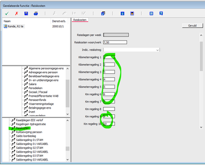 Vervolgens leg je per dienstverband vast welke kilometer regeling actief zijn per medewerker. Je doet dit uiteindelijk via Self Service om te zorgen dat alle nieuwe medewerkers/dienstverbanden direct de juiste kilometer regelingen krijgen. Maar als je het voor het eerst gaat gebruiken doe je het via collectief muteren in HR Core Beaufort. Of natuurlijk gewoon voor één dienstverband op een scherm in HR Core Beaufort. Hier zie je een voorbeeld van een medewerker die kilometer regeling 1 t/m 7 en 9 & 10 actief heeft (dus alleen regeling 8 niet).