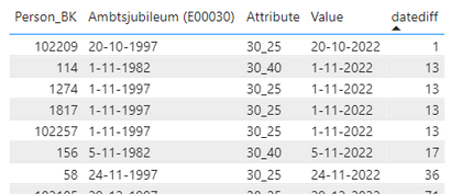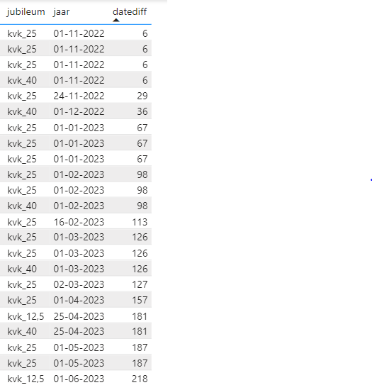 De tweede vraag. Het is niet mogelijk om van iedereen alle jubilea data in 1 kolom te krijgen. Met het aanmaken van de extra kolom kan je op elke regel 1 extra waarde toevoegen. Maar jij zou er nu 3 willen en dat is helaas niet mogelijk. Dsu het blijven 3 losse kolommen 1 van 12,5 jaar 1 van 25 jaar en 1 voor de 40 jaar. Wat hierin wel mogelijk is is dat je een kolom maakt waarbij je van iedereen alleen het jubilea laat zien dat in het huidige jaar valt of iets dergelijks. Dan krijg je iets als: Dat in service dan vervangen door E00030