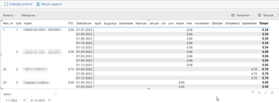 Op regel niveau wil ik de persoonsgegevens (pers nr, dvb, naam) als kolommen de maanden van het desbetreffende jaar. als waarde wil ik graag het aantal FTE tonen. als mdw 123456 in januari t/m mei 0,5 FTE was, dan moet er in die 5 cellen 0,5 staan. Werkt ze in juni en juli fulltime, dan moet er 1 komen te staan. Daarna gaat ze weer terug in uren en staan augustus t/m december weer op 0,5. Wanneer medewerker 246813 pas in mei is begonnen met werken, dan zijn alleen de cellen mei t/m december gevuld. Het gaat bijvoorbeeld dus om de 2023. Ook al heeft een medewerker maar 1 maand gewerkt in dat jaar, dan moet deze op het overzicht naar voren komen. Het moet ook kijken naar de actieve dienstverbanden in die periode