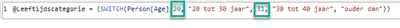 Leeftijdcategorie = SWITCH(True(),Person[Age]<20,"0-20",AND(Person[Age]<30,Person[Age]>20),"20-30",AND(Person[Age]<40,Person[Age]>30),"30-40",AND(Person[Age]<50,Person[Age]>40),"40-50",AND(Person[Age]<61,Person[Age]>50),"50-60")