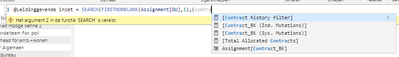 De tabellen inzet en roltoewijzingen zijn in reporting niet aan elkaar te knopen. Ik had gehoopt dit te kunnen doen dmv een soort van 'verticaal zoeken'. Hiervoor heb ik de functie search gebruikt. Als ik in deze functie gebruik maak van de tabel assignment, dan kan ik verderop niet kiezen voor de tabel contract role assignments, zie ook onderstaande printscreen.