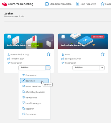 Ik heb een van de standaard rapporten gepakt (individuele loonstaat) en daar een kopie van gemaakt. je moet dan wel naar mijn rapporten gaan. Dan kan je wel kiezen voor bewerken