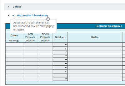 In de release notes van Self Service van 9 september staat aangekondigd dat de tekst "Auto" in een declaratieblad aangepast zou worden naar "Automatisch berekenen". Dit om eventuele verwarring te voorkomen voor mensen die reiskosten declareren, maar niet met de auto gereisd hebben. Wij zien echter vandaag nog steeds de knop "Auto" staan.