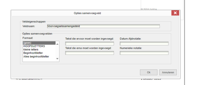 In dit geval is dat bij het veld Voorvoegsels een spatie. De spatie wordt dan alleen afgedrukt als ook het samenvoegveld gevuld is.