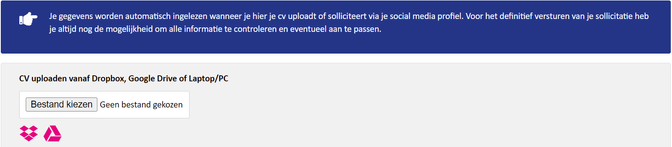 Als kandidaten bij ons solliciteren heb je bovenaan het sollicitatieformulier de mogelijkheid om je gegevens uit te laten lezen via een cv of sollicitatieformulier.