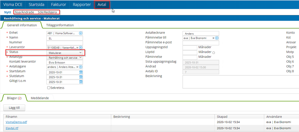 Följande steg går igenom hur ett eller flera registrerade avtal raderas från DCE. För att radera ett avtal behövs tillgång till DCE-admin.