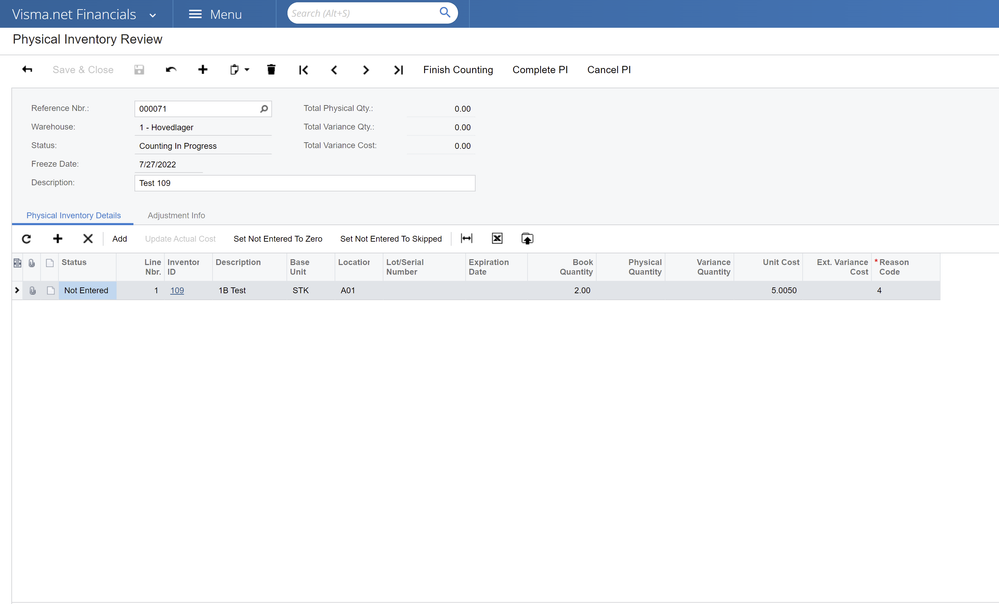 Stocktake with only one line. When I try to update this line and add another line with a different location (that is defined in the Physical Inventory Type and valid - works in UI) with the following request: