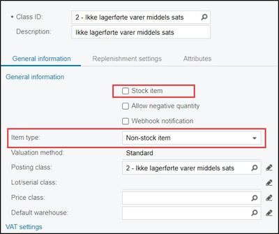 We have tried changing class to itemclass 2 and 9 (ej lagerförda artiklar) which are non stock item classes , still same error.