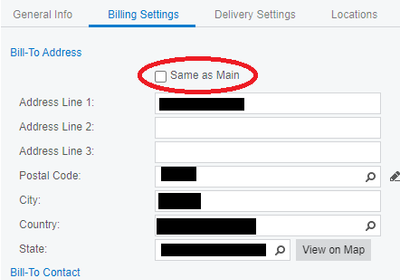 - supplying the same data as the main record (overwrite the Billing address with the Main address) will result in a separate address record, and "same as main" will not be checked: