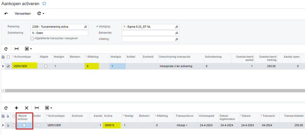 Zie onderstaande afbeelding ter illustratie. Hierin wordt getoond hoe ik een inkoopnota van €250,- toevoeg aan het activum 000015.