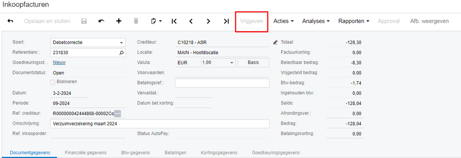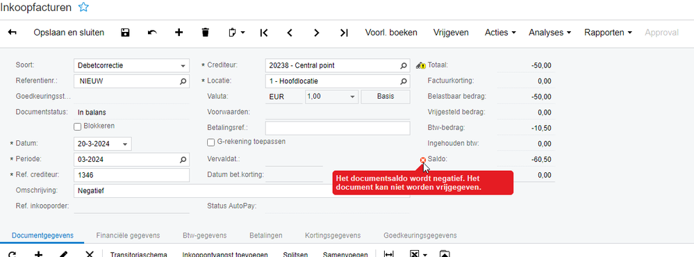 Hoi @Johan Pijnenburg het is niet mogelijk om een debetcorrectie met een negatief saldo vrij te geven (zie afbeelding). Wellicht bedoel je het anders of is het een ander type document?