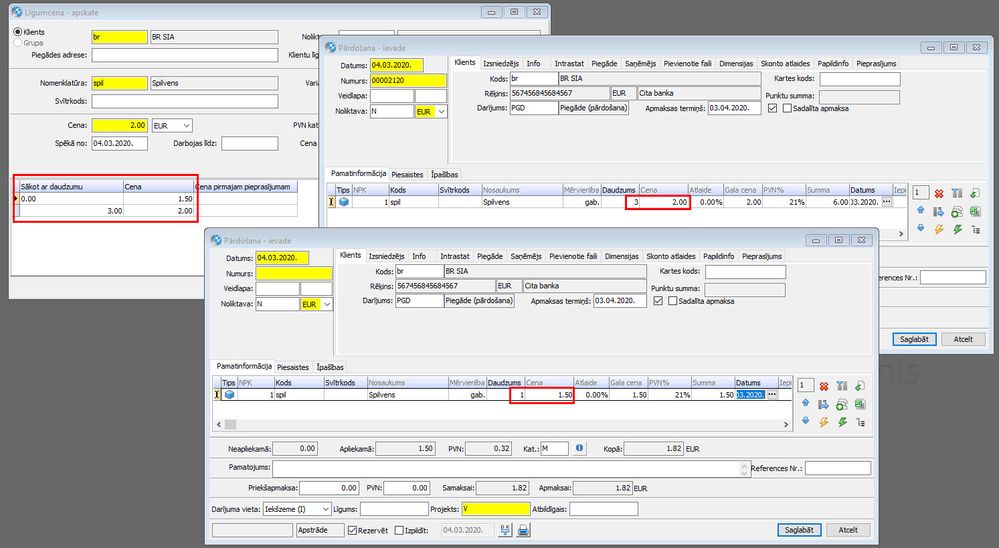 Vēlētos noskaidrot kā pavadzīmē norādīt, ka pērkot 3 vienādas preces to cena ir 2 euro par 1 gabalu, bet pērkot mazāk šīs pašas preces cena ir 1,50 euro par 1 gabalu.