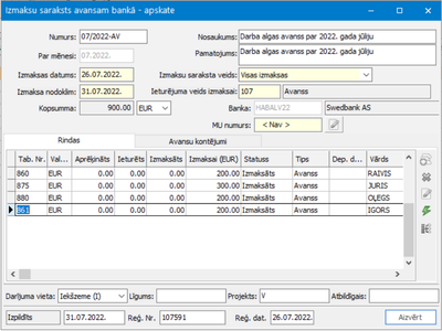 Jāizveido "Izmaksu saraksts uz bankām" ar Ieturējuma veids izmaksai Avanss, jāsaglabā (var izpildīt). Tad labot, iezīmē rindas un ģenerē individuālos MU.