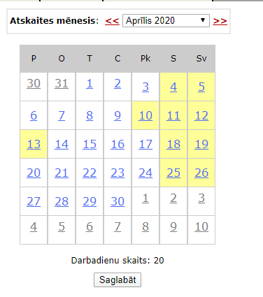 Ja šie kalendāri tiks uzturēti aktuāli, tad jums vairs nenāksies saskarties ar situāciju, ka mēnesī, kurā, piemēram,  ir tikai 20 darbadienas, tabelē jāatzīmē 22.