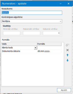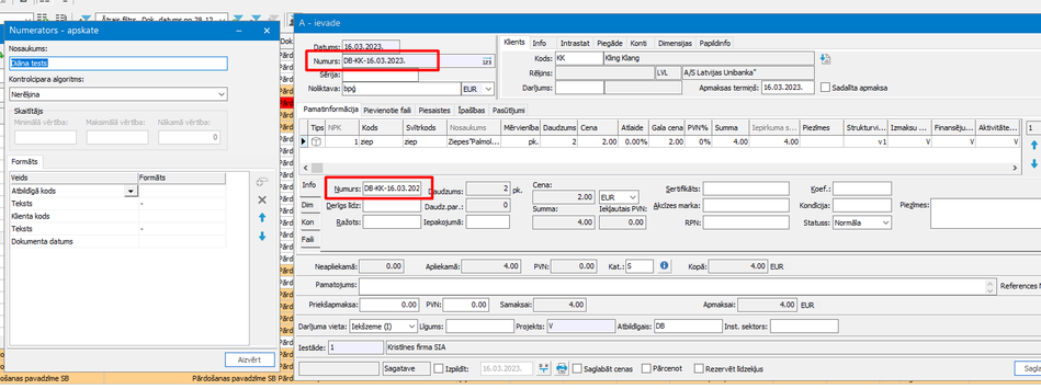 Diemžēl numeratorā piedāvāta iespēja "Klienta kods" nedod nekādu vērtību. Tāpat dokumenta datums numeratorā parādās 1899.gads. Turpretī sistēmas datums un atbildīgā kods no dokumenta tiek ielasīts pareizi.