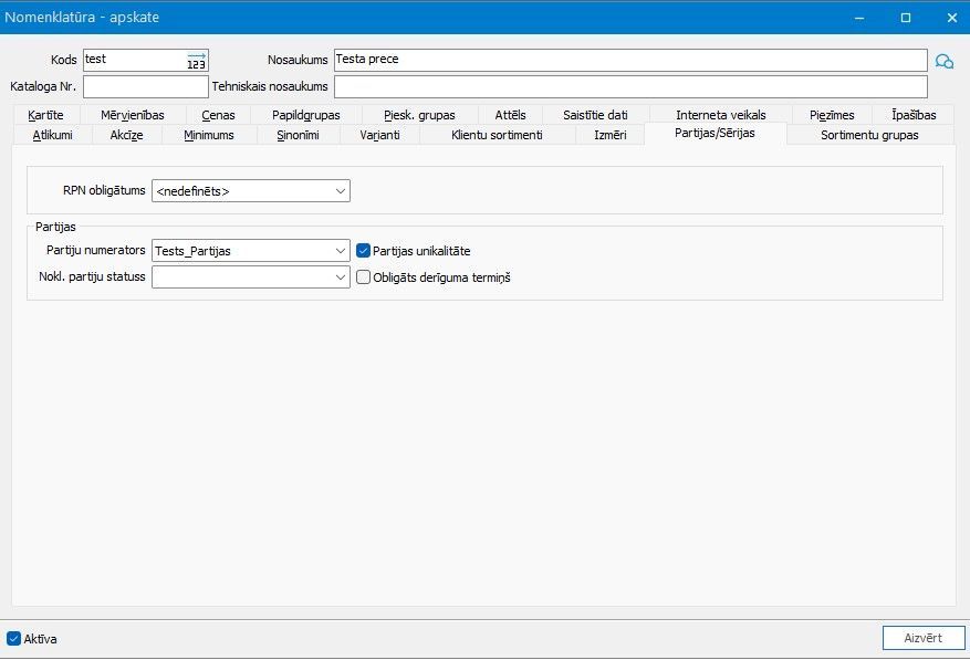 Jā, partijas numurs diemžēl nedarbojas, es nemēģināju to pievienot kā partijas numeratoru, bet gan tikai kā dokumenta tipa numuru un tā, kā pašā nomenklatūras kartītē partijas numerators nav norādīts, tad sistēma partijas numuru noklusēti aizpilda ar dokumenta numuru.