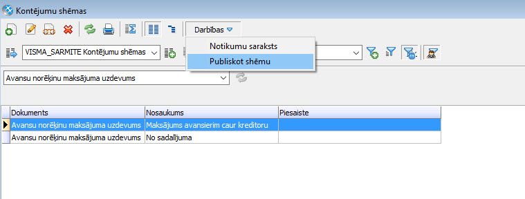 Ja doma ir pārnest kontējumu shēmas no vienas firmas uz otru vienas instalācijas ietvaros, tad risinājums šādai vēlmei ir kontējumu shēmu publiskošana. Izpildot šo darbību, kontējumu shēma automātiski kļūst pieejama VISĀS instalācijas firmās. Kontējumu shēmu sarakstā, izliekot izskatā kolonnu <Piesaiste>, var redzēt, vai kontējumu shēma ir individuāla (šajā gadījumā šeit uzrādīsies firmas nosaukums) vai publiskota (uzrādās tukšums). Publiskotu shēmu priekšrocība ir tā, ka, veicot labojumus tajā, tas automātiski salabojas visās iestādēs, jo shēma ir visiem kopīga.