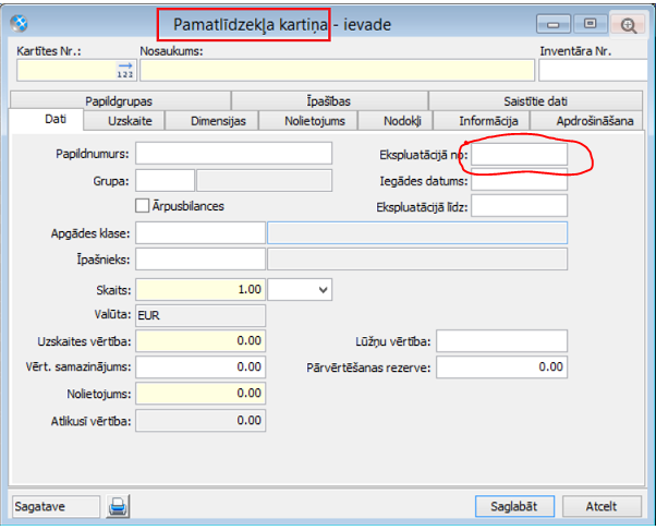 Pamatlīdzekļu kartītē lauks "Ekspluatācijā no" tiek aizpildīts no iegādes vai ekspluatācijā nodošanas dokumenta datuma vai arī paliek tas datums, kas manuāli jau ierakstīts veidojot kartīti. Jebkurā no variantiem lauks ir labojams tikai tad, kad kartīte ir statusā Sagatave. Tāpēc ir jāatceļ visi dokumenti un tie pēc tam jāpārrēķina. Svarīga ir atcelšanas secība no šodienas (no pēdējā dokumenta) līdz iegādes dokumentam. Un tik par svarīga ir pārrēķināšanas un atkārtotas izpildes secība - no iegādes dokumenta līdz šodienai.