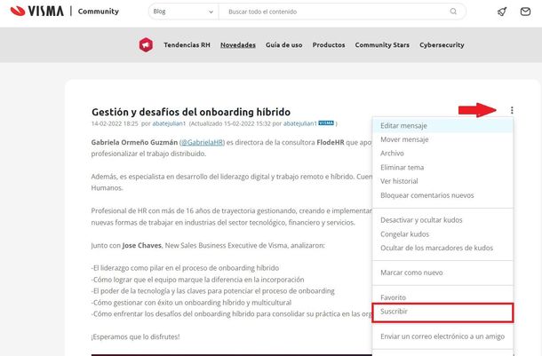Si quieres estar siempre informado sobre un tema en particular, puedes suscribirte a una publicación en particular. Para hacer esto, debes ir al artículo, hacer click en los tres puntos en la parte superior derecha del artículo y luego seleccionar “suscribir".