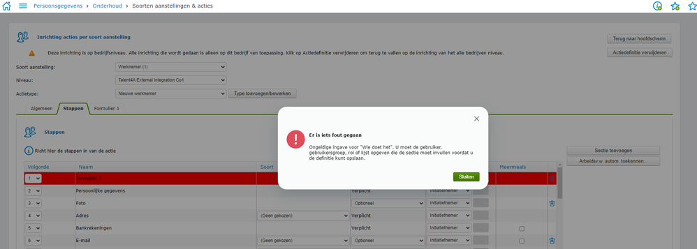 Bij persoonsgegevens, onderhoud, Aanstellingen en acties moet je steeds naar beneden scrollen. Ook de "Opslaan" knop staat onderaan. Als je hebt opgeslagen ben je erg geneigd om meteen naar de volgende te gaan. Nu moet je echter weer helemaal naar beneden scrollen om te controleren of het opslaan is gelukt, of dat er een foutmelding staat, doordat je iets bent vergeten. Anders ben je je wijzigingen kwijt.