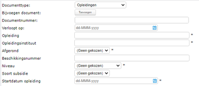 Onderstaand een voorbeeld van hoe we het nu hebben ingericht. De startdatum opleiding (is vrij veld datum) staat onderaan, maar die zouden we graag bovenaan willen hebben.