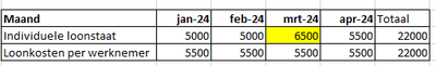 Voorbeeld: loonkosten €5000, verhoging € 500 per 1-1-2024 verwerkt in 3-2024