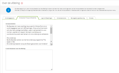Algemene organisatie tekst voor alle scholen + introductie tekst per school. De algemene tekst wordt overruled. in vacature template is geen optie, aangezien als tekst wijzigt dan alle templates aangepast moeten worden. beheer op 1 centrale plek, bijvoorbeeld 37 scholen wordt 38 scholen.