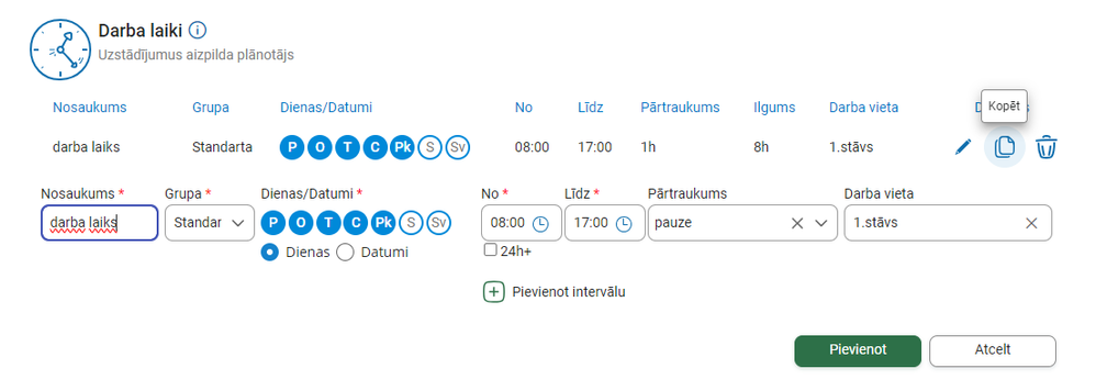 Uzstādījumu sadaļā realizēta darba laiku kopēšanas funkcionalitāte, lai paātrinātu datu ievadi.