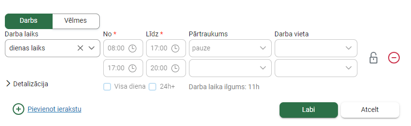 Uzlabots dialoglogs, lai var redzēt darba laika intervālus (ja vienam ir vairāki) un tiem piesaistītos pārtraukumus.