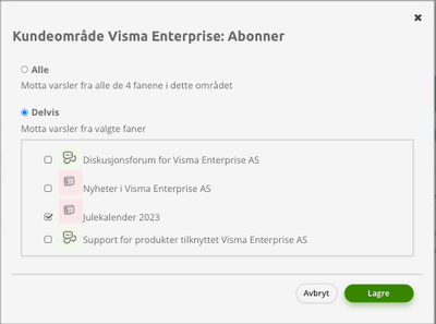 - Velg om du ønsker å huke av for "alle" eller "delvis". Dersom du kun ønsker å abonnere på julekalenderen (som er helt lov) velger du denne, og deretter kun huker av for "Julekalender 2023".