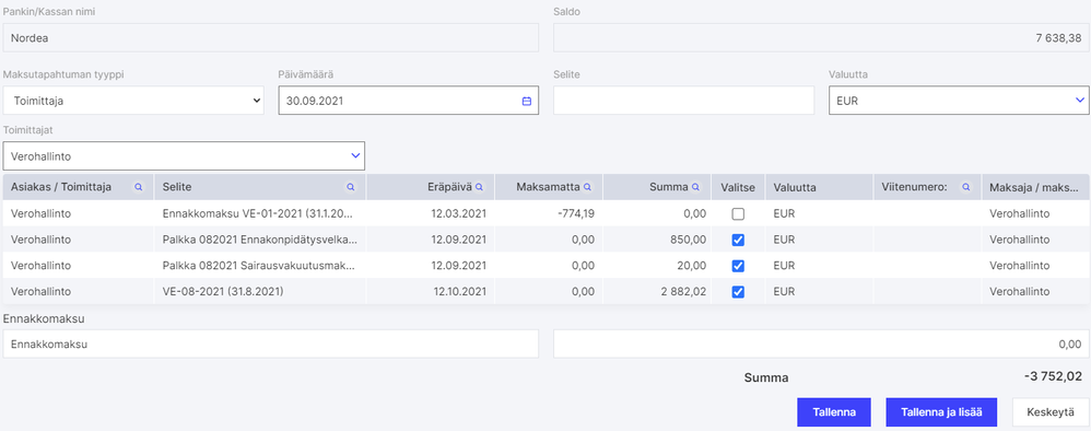 Ennakkoveron maksaminen: ks. kohta Arvonlisäveron, ennakonpidätyksen ja sairausvakuutusmaksun maksukirjaukset.
