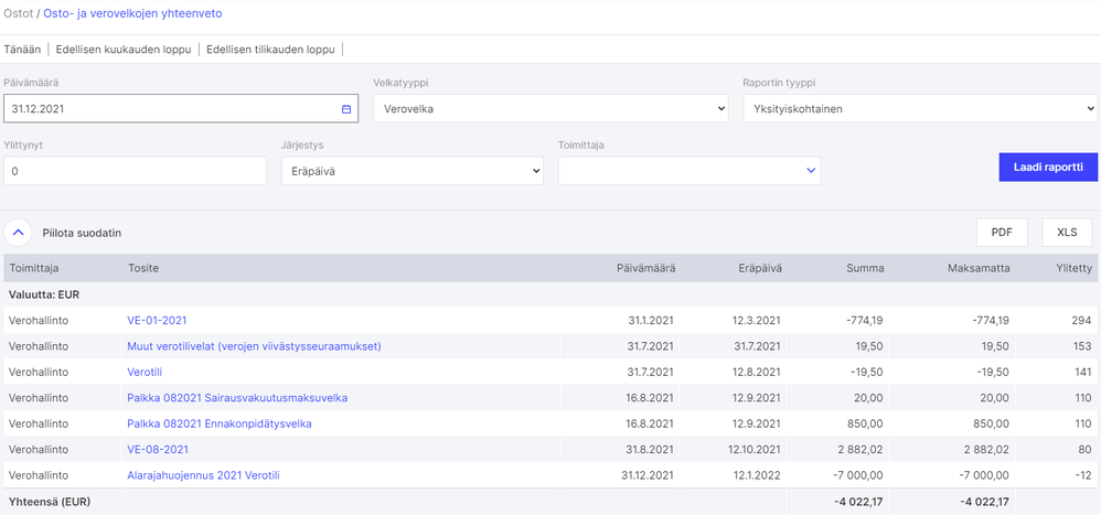 Kaikki Verohallinnolle maksettavat summat näkyvät Osto- ja verovelka -raportista, jonka saa valikosta Ostot > Osto- ja verovelkojen yhteenveto valitsemalla haluttu päivämäärä, muuttamalla Velkatyypiksi: Verovelka ja painamalla: Laadi raportti