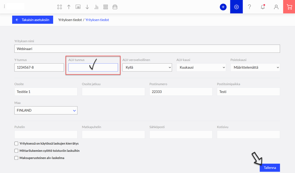 1. Asetukset - Yrityksen tiedot - Syötä ALV-tunnus -kenttään ALV-tunnuksesi ja Tallenna.