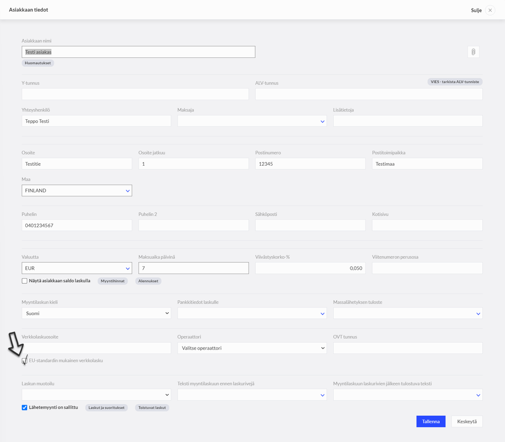 2. Klikkaa EU-standardin mukainen verkkolasku valinta asiakkaan tiedoissa ja Tallenna.