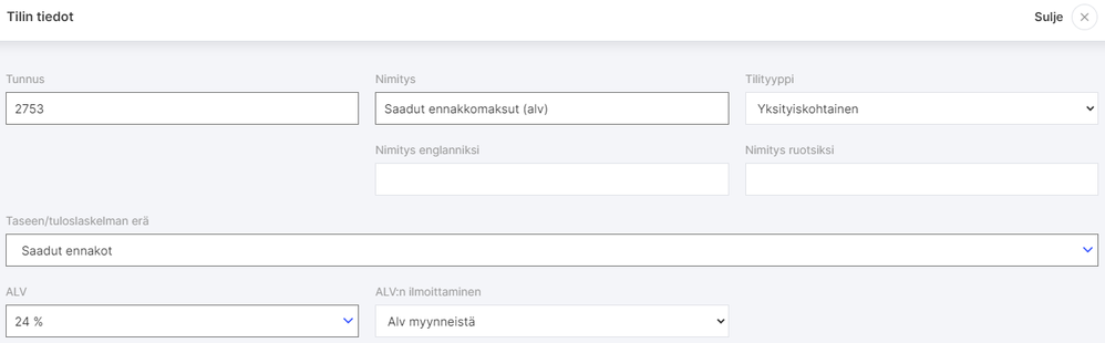 Mikäli tilikartasta puuttuu ennakkomaksujen tili (2753), lisää se valikossa Asetukset > Kirjanpidon asetukset > Tilikartta.