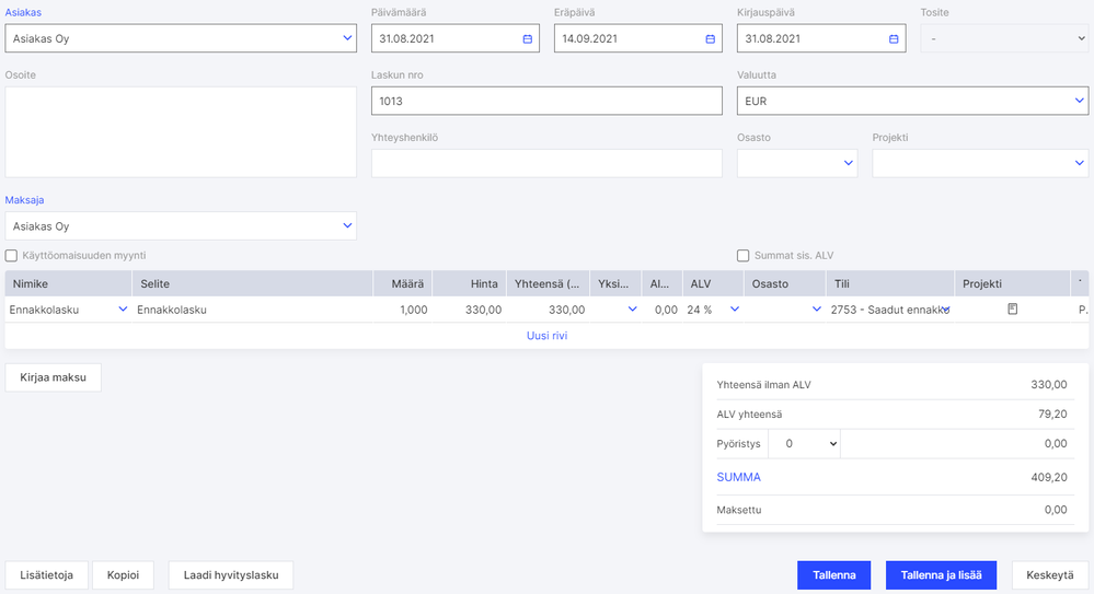 Laadi ennakkolasku samalla tavalla kuin laatisit myyntilaskun, mutta valitse Nimike-kenttään Ennakkomaksu, syötä Määrä ja A-hinta-kenttään arvonlisäveroton hinta.