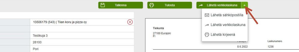 Laskun lähetystapa on mahdollista valita sen mukaan, mitä tietoja asiakkaasta on annettu. Lähetystavan saa vaihdettua lähetyspainikkeen oikealla puolella olevasta nuolesta.
