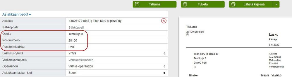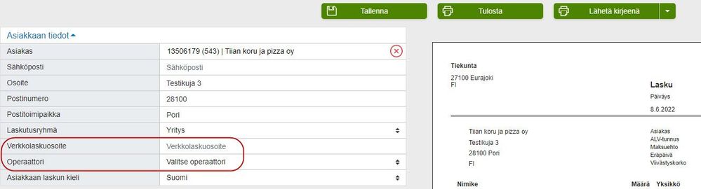 Jotta laskun voi lähettää verkkolaskuna, tulee sekä verkkolaskuosoite että operaattoritieto olla asetettuna. Tiedot voi asettaa joko asiakaskortille tai suoraan laskulle asiakkaan tietoihin. Tarkempi ohje verkkolaskuosoitteiden asettamisesta löytyy täältä.