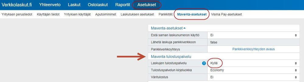 Kun Maventan tulostuspalvelu on otettu käyttöön, (Asetukset-> Maventa-asetukset -> Maventa tulostuspalvelu) voit lähettää laskun myös kirjeenä. Silloin lasku tulostetaan ja postitetaan puolestasi tulostuspalvelussa. Laskut tulostetaan aina yön aikana, ja ne siirtyvät postin jakeluun seuraavana arkipäivänä. Toimitusaika riippuu valitusta kirjeluokasta.