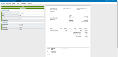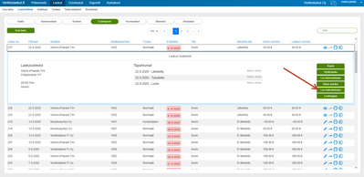 Näet luodut maksumuistutukset laskuhallinnasta. Klikkaa laskuriviä esimerkiksi asiakkaan nimen kohdalta, niin saat esiin laskun tarkemmat tiedot ja lisää vaihtoehtoja. Maksumuistutukset-välilehdellä näet luodut maksumuistutukset. Kirje-ikonista muistutus on mahdollista lähettää sähköpostilla, ja tulostin-ikonista saat tulostettua maksumuistutuksen.