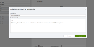 3. Voit joko Tulostaa tai Lähettää sähköpostilla laatimasi maksumuistutuksen. Mikäli valitset Lähetä sähköpostilla, niin avautuu lähetysikkuna johon voit kirjoittaa vielä oman vapaavalintaisen viestisi, joka tulee lähetettävään sähköpostiin.