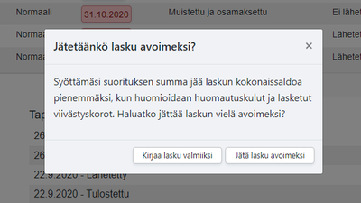Tallaisessa tilanteessa voit suoritusta kirjatessa vaihtaa suoritettavaksi summaksi sen, minkä olet myös saanut pankkitilillesi. Ohjelma havaitsee sen, että suoritettu summa ei vastaa sitä laskun kokonaissaldoa, kun huomioidaan muistutuskulu ja viivästyskorko. Ohjelma kysyy tässä vaiheessa, että haluatko jättää laskun yhä avoimeksi, ja pyytää vielä tätä korkokulua jälkeenpäin asiakkaaltasi.