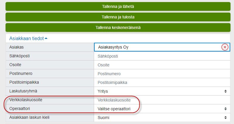 Verkkolaskuosoitteen lisäksi tulee ilmoittaa asiakkaan käyttämän operaattorin nimi.