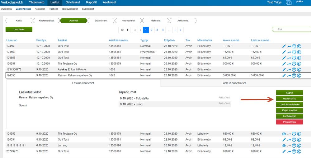 Valitse tämän jälkeen oikealle avautuvista painikkeista " Hyvityslasku".