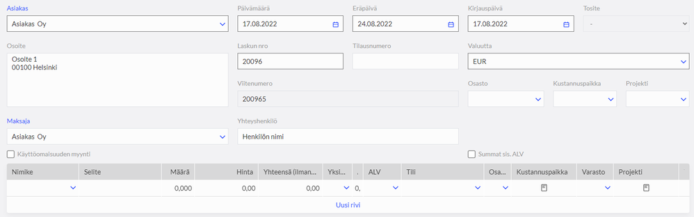 Ohjelma täyttää Laskun nro:n automaattisesti Yleisissä asetuksissa olevan myyntilaskun numerosarja-asetusten mukaisesti.