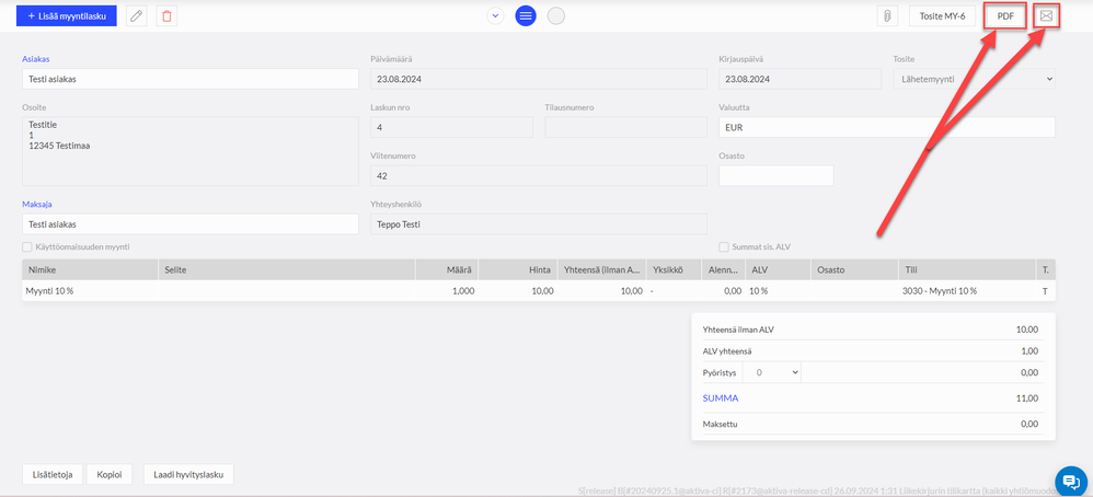 Voit syöttää uuden myyntilaskun painamalla Lisää myyntilasku.