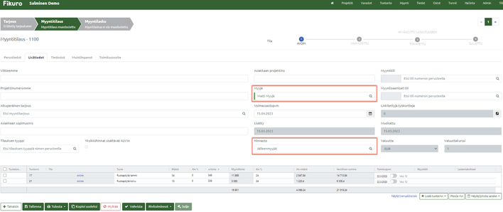 Mikäli myyntitilaus liittyy johonkin projektiin, annetaan myös projektitieto.