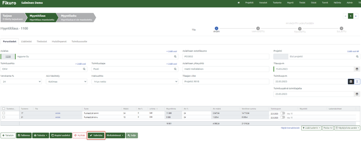 Kun myyntitilaus on kirjattu ja tallennettu järjestelmään, tulee se vielä vahvistaa. Vain vahvistetuista myyntitilauksista on mahdollista muodostaa työkortteja tuotannon puolelle. Lisäksi myyntitilauksen tulee olla vahvistettu, jotta siitä voi muodostaa toimituksen. Huom! Vahvistettuja myyntitilauksia ei voi poistaa järjestelmästä. Myyntitilaus vahvistetaan painamalla alareunan Vahvista-painiketta.